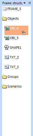 Task Pane in the "Frame Structure" mode displays current Frame ID and list of all Objects (also Groups and Scenarios), that are used on the Frame. Objects within a Frame appear sequentially. The newly created objects displayed first, therefore they are covered by objects, which have been created later. كل منطقة لديها كائن كائن ID والايقونات الصغيرة هي التي يصور المعلمات كائن إضافية ل: