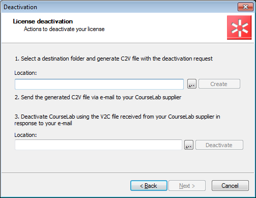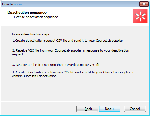 بعد تتلقى ردا من المورد الخاص بك مع ملف V2C المرفقة، حفظ هذا الملف على القرص المحلي، انتقل إلى الشاشة ايقاف التشغيل نفس معالج الترخيص، حدد موقع الملف في الحقل المقابل واضغط التالي. سيتم إلغاء تنشيط ترخيص على هذا الكمبيوتر وسيتم إنشاء ملف آخر C2V - إرساله إلى المورد CourseLab لتأكيد التعطيل الترخيص.