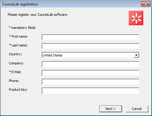ملء بيانات التسجيل الخاصة بك ثم اضغط التالي. إذا اتصال إنترنت موجود أن البيانات الخاصة بك على الفور أرسلت إلى خادم CourseLab التسجيل.