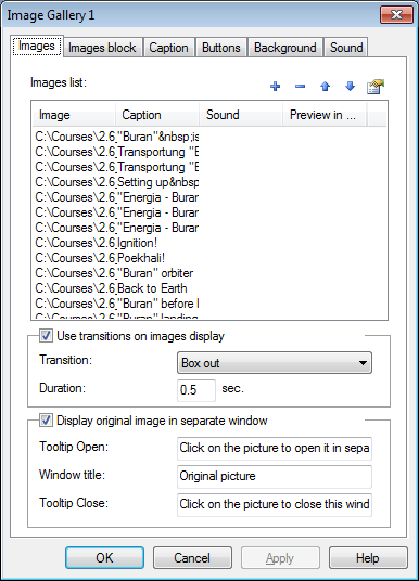 في تبويب الصور تستطيع تعريف قائمة من الصور مع الوصف وخيارات أخرى لكل صورة مثل تأثيرات الانتقال ونمط الانتقال وملفات الصوت.