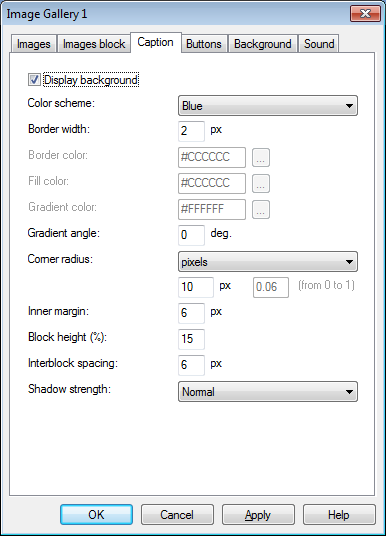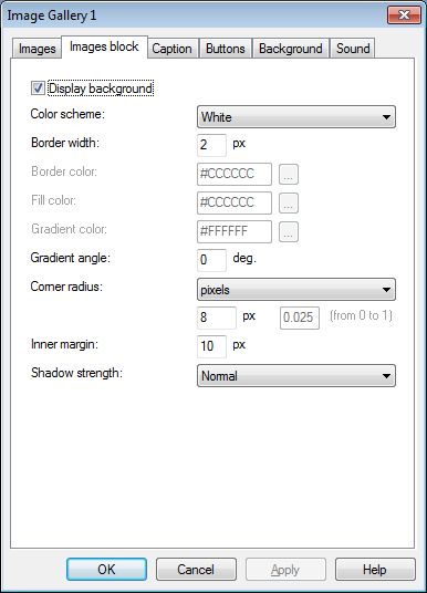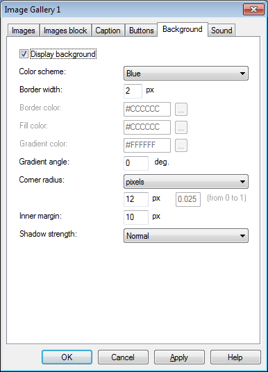 في التبويب "الخلفية" يمكنك التحكم بعملية إظهار او اخفاء خلفية للكائن "معرض الصور" مع امكانية التخصيص وتعريف برامترات تلائم هذا الكائن