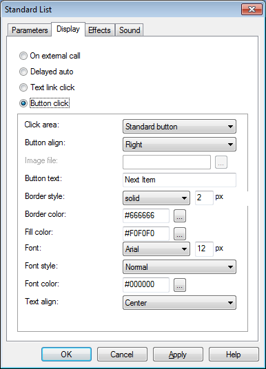 في التبويب "Display" ستجد عدة خيارات من أجل تخصيص وتحديد طريقة العرض للكائن:-الخيار "External call " أو كما يسمى باللغة العربية "الاتصال الخارجي" وهذا يعني بأن الكائن يظهر عند استخدام الخاصية NEXT ITEM الموجودة ضمن الإجرائية Method- الخيار"Delayed auto" أو كما يسمى باللغة العربية "تأخير تلقائي" حيث يتم العرض بعد فترة زمنية نقوم بتعريفها ضمن الخيار "فترة تأخير عرض البند".- الخيار "Text link click" ويعني بأنه سيتم عرض بنود القائمة عند الضغط على هذا الخيار ويحتوي اسم افتراضي وهو "Next Item" يمكن تعديله لاحقاً.- أما في الخيار "Button click" فسيتم عرض بنود القائمة عند الضغط على زر يظهر أسفل الكائن، كما يمكن تخصيص الزر لكي يتلاءم مع الكائن.