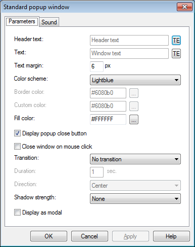 في التبويب "البرامترات" ستجد نظام ألوان معد مسبقاً للكائن ويمكنك اختيار اللون المناسب من القائمة. كما يمكنك وضع عنوان ومحتوى للنافذة من خلال الضغط على زر "TE" الأول والثاني وبالتسلسل والموجودين بنفس التبويب.