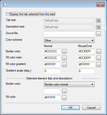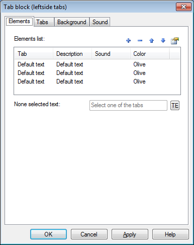 ولكل تبويب يمكن تعيين: نص التبويب، الوصف، ملف صوتي خاص لهذا العنصر و كذلك ضبط لون العنصر الذي سيظهر عند تنفيذ المقرر.
