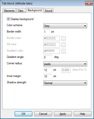 في التبويب"خلفية" يمكن ضبط لون الخلفية الخاصة بالكائن وتحديد سماكة و لون الحدود و الهوامش الداخلية و نظام الألوان.