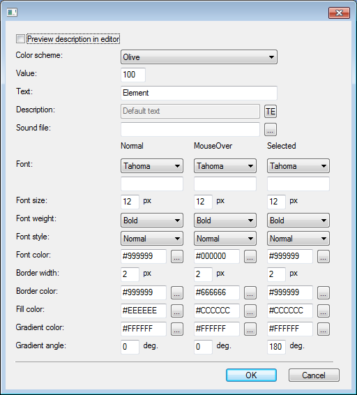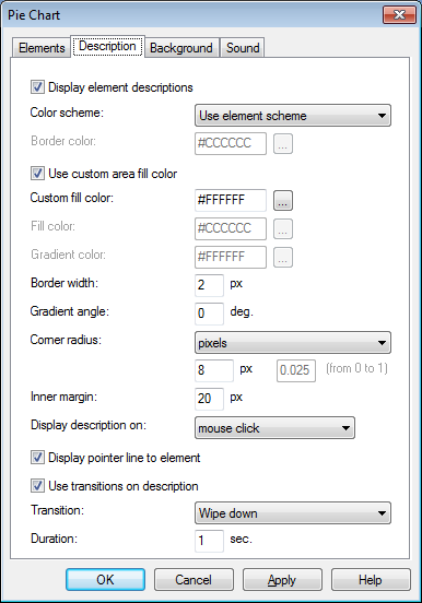 من خلال التبويب "الوصف" يمكن ضبط لون الحدود و لون التعبئة و تحديد الألوان المتدرجة عند العرض و تحديد سماكة الحدود و الزوايا و تحديد الهوامش الداخلية و الفترة الزمنية .