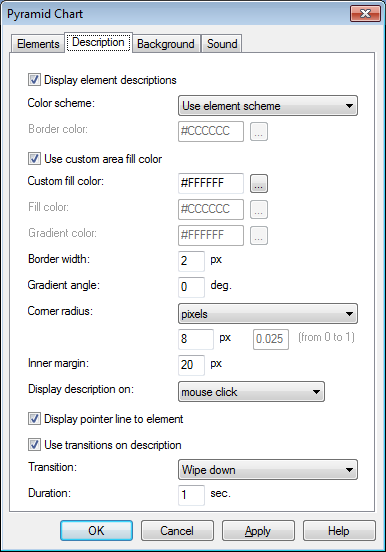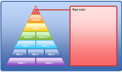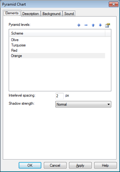 في التبويب "العناصر" يمكن إضافة عدد من المستويات التي ستظهر في الرسم البياني الهرمي؛ حيث يمكنك ضبط كل مستوى باللون و التسمية المناسبة، النص، الوصف.ويمكن تقسيم كل مستوى إلى مستويات فرعية من خلال تعريف عناصر جديدة ضمن "قائمة العناصر" الموجود ضمن كل مستوى.تذكر بأنه لايمكن تقسيم المستوى الأعلى من الكائن إلى مستويات عدة مستويات فرعية وفي حال قمت بإضافة عدة مستويات فرعية للمستوى الأعلى فإنه لن يظهر سوى أول مستوى فرعي قمت بإضافته.