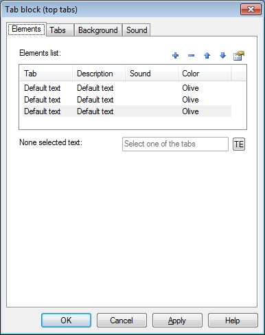 ولكل تبويب يمكن تعيين: نص التبويب، الوصف، ملف صوتي خاص لهذا العنصر و كذلك ضبط لون العنصر الذي سيظهر عند تنفيذ المقرر.