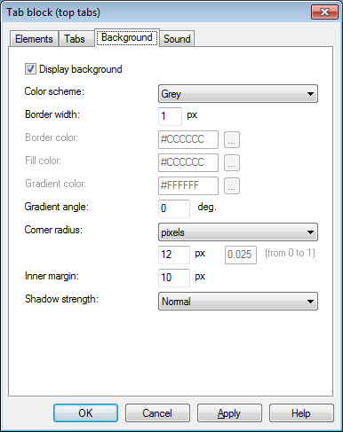 في التبويب"خلفية" يمكن ضبط لون الخلفية الخاصة بالكائن وتحديد سماكة و لون الحدود و الهوامش الداخلية و نظام الألوان.
