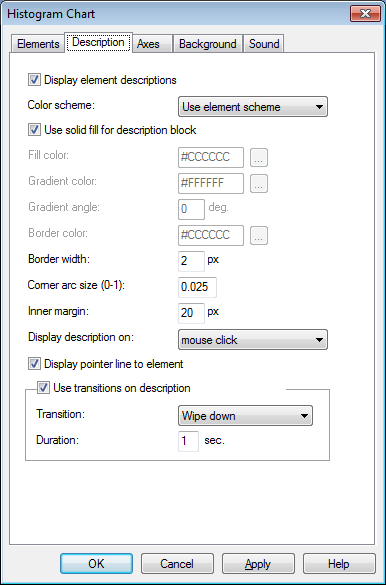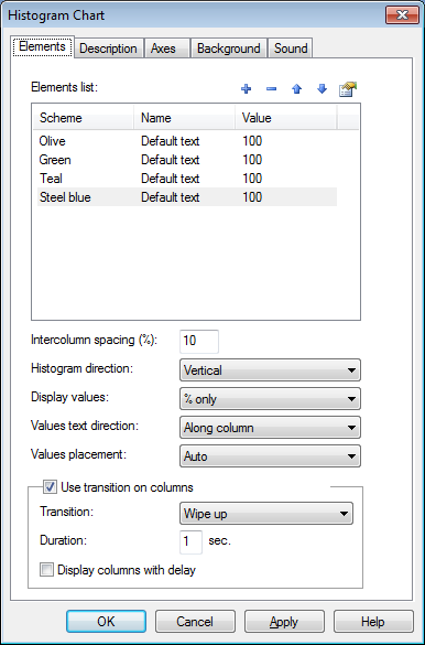 في التبويب "العناصر" يمكن إضافة عدد من المستويات التي ستظهر في مخطط الرسم البياني؛ حيث يمكنك ضبط كل مستوى باللون و التسمية المناسبة، النص، الوصف.- تذكر بأن مستويات الكائن ستظهر بشكل أعمدة تبعاً لترتيب الإنشاء.- استخدم زر "+" لفتح نافذة خصائص هذا المستوى.