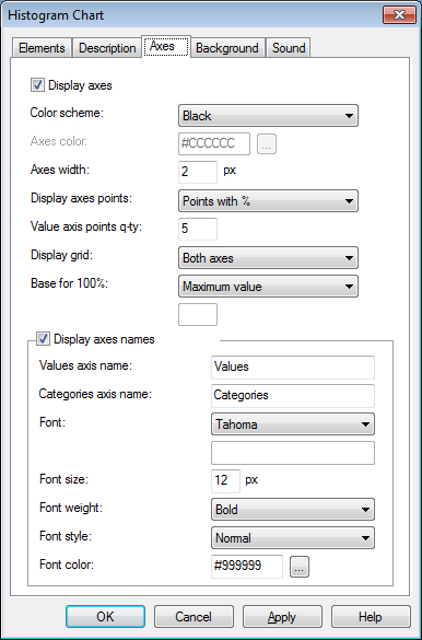من خلال الخيار الأول في التبويب "محاور" يمكن إيقاف عرض المحاور أو القيم التي يشكلها كل مستوى ضمن مخطط الرسم البياني أو إظهارها، ويمكن أيضاً تخصيص التنسيق ليتناسب مع ألوان الكائن.