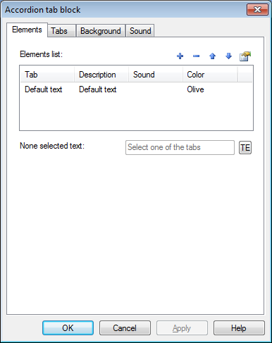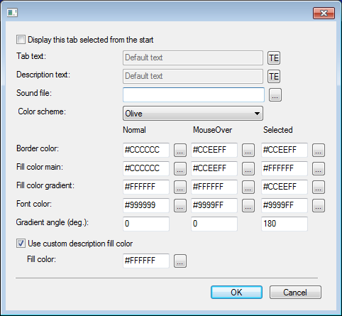 ولكل تبويب يمكن تعيين: نص التبويب، الوصف، ملف صوتي خاص لهذا العنصر و كذلك ضبط لون العنصر الذي سيظهر عند تنفيذ المقرر.