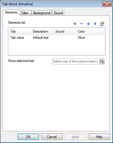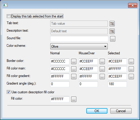 ولكل تبويب يمكن تعيين: نص التبويب، الوصف، ملف صوتي خاص لهذا العنصر و كذلك ضبط لون العنصر الذي سيظهر عند تنفيذ المقرر.