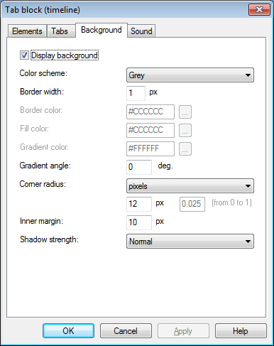 في التبويب"خلفية" يمكن ضبط لون الخلفية الخاصة بالكائن وتحديد سماكة و لون الحدود و الهوامش الداخلية و نظام الألوان.