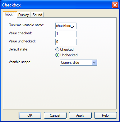 مربع اختيار يتيح للمتعلم باختيار الخيار نعم أو الخيار لأ , والقيم المدرجة في الحقل يمكن الحصول عليها من خلال المتحولات المستخدمة في الكورس لاب حيث يمكن الاستفادة منها وتوظيفها ضمن إجرائيات أخرى.
