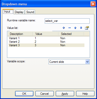 قائمة منسدلة يسمح للمتعلم باختيار خيار واحد فقط من القائمة, والقيم المدرجة في الحقل يمكن الحصول عليها من خلال المتحولات المستخدمة في الكورس لاب حيث يمكن الاستفادة منها وتوظيفها ضمن إجرائيات أخرى.