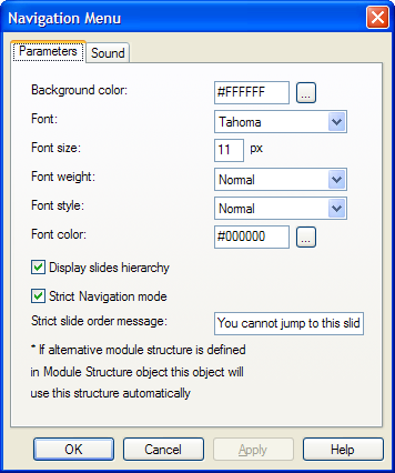 Navigation Menu enables tracing of the current Slide name and an instant transition to another Slide upon selecting its name (if there are no restrictions for such transition by other conditions). In case there exists Alternative path in the Module, object will use alternative Module structure from Alternative path.