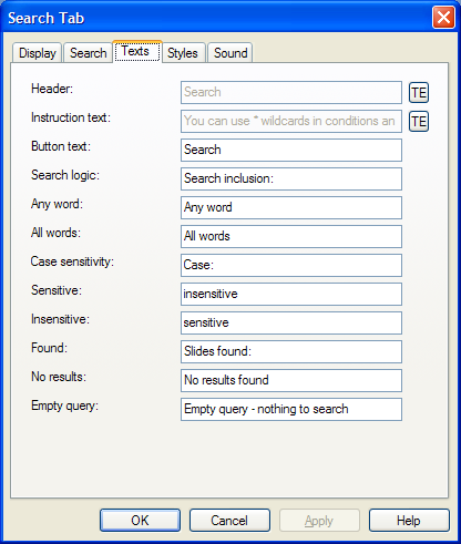 في تبويب النص يمكنك تحديد الرسائل و التلميحات التي سيتم عرضها للمتعلم .