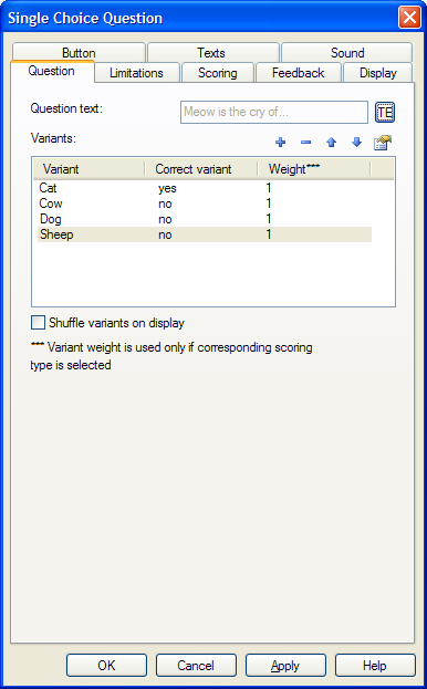 استعمل زر + لاضافة الأجوبة المحتملة , سيفتح نافذة فرعية اضغط على زر TE و ادرج نص الجواب الممكن و حدد في حال هذه الإجابة صحيحة أم خاطئة.
