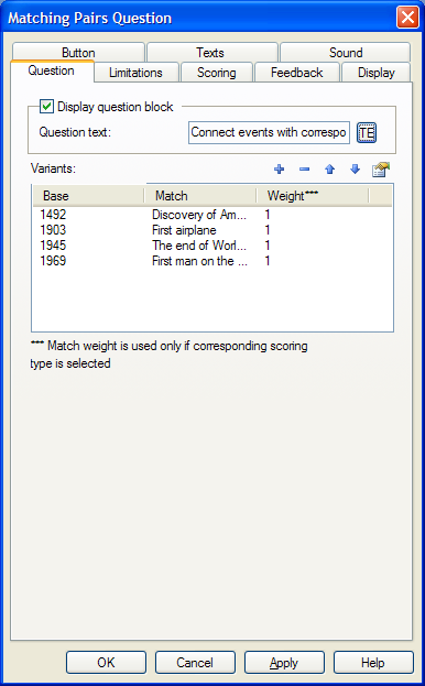 استعمل الزر "+" لإضافة قائمة من الأجوبة لكل بند من بنود الأسئلة. وبعد فتح النافذة اضغط على زر TE لإدراج الطرف الثابت ونص المطابقة.