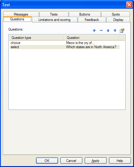 استخدم التبويب "الأسئلة" لإضافة عدد من الأسئلة في القائمة و ذلك بالضغط على زر "+" حيث تفتح شاشة محرر الاسئلة و تكون مشابه للاسئلة التي تم التطرق اليها سابقاً .