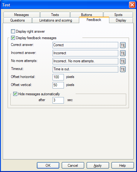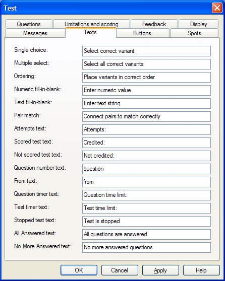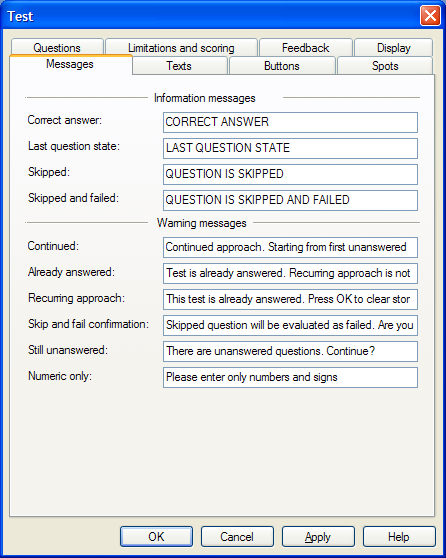 وفي تبويب "النصوص" يمكن تحرير معلومات و رسائل تحذير خاصة بالكائن "الاختبار" .