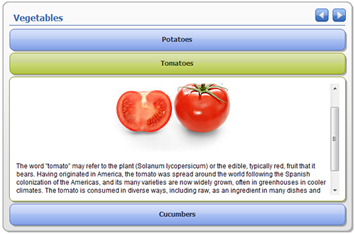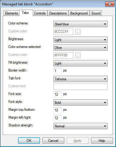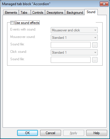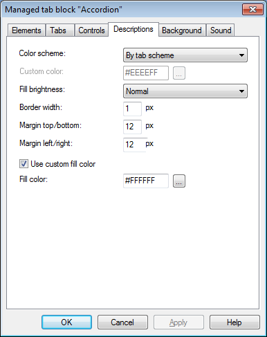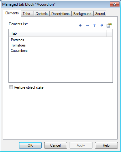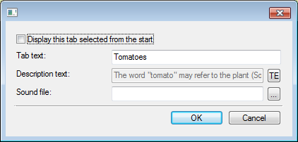 Tab text - short text that will be displayed on the Tab. Description - full text that will be displayed in Description Area of the Object when corresponding Tab is selected. This is Rich Text field - it can contain pictures, tables, links etc. Scroll bar will be added automatically when text size will exceed Description Area size. For each element you can define sound file with narration.