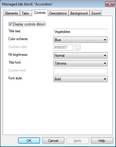 Tab block objects are used for displaying group of similar descriptions in one tabbed block. This type of Object its own Controls ribbon with Next/Previous buttons.
