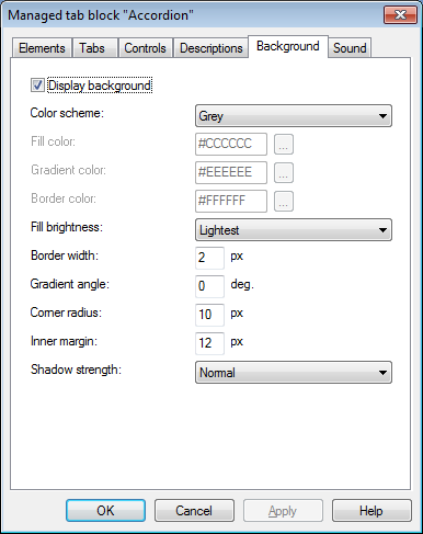 في التبويب"خلفية" يمكن ضبط لون الخلفية الخاصة بالكائن وتحديد سماكة و لون الحدود و الهوامش الداخلية و نظام الألوان.
