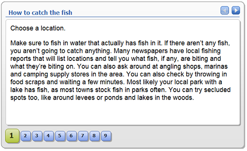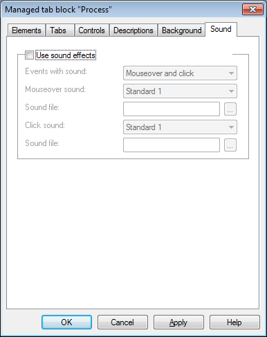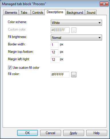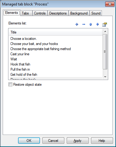 Tab text - short text that will be displayed on the Tab. Description - full text that will be displayed in Description Area of the Object when corresponding Tab is selected. This is Rich Text field - it can contain pictures, tables, links etc. Scroll bar will be added automatically when text size will exceed Description Area size. For each element you can define sound file with narration.