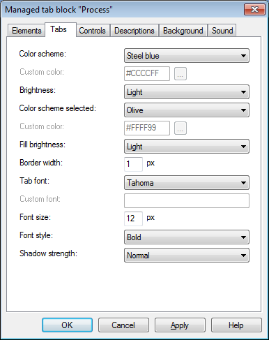 Select color schemes for idle and selected states - one of predefined or custom. You can also lighten or darken colors of selected color schemes. Change Tab font settings.