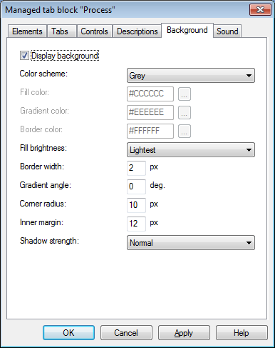 في التبويب"خلفية" يمكن ضبط لون الخلفية الخاصة بالكائن وتحديد سماكة و لون الحدود و الهوامش الداخلية و نظام الألوان.