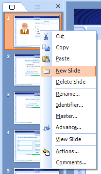 لاضافة شريحة جديدة: اختر إدراج > شريحة جديدة . أو من خلال الضغط بالزر الأيمن على منطقة الشرائح واختيار "شريحة جديدة"