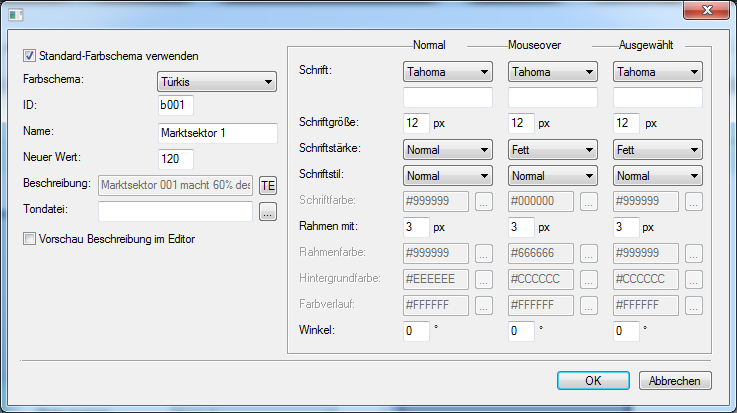 Sie können ein vordefiniertes Farbschema oder benutzerdefinierte Farben verwenden (in diesem Fall werden die Werte, die im rechten Teil des Fensters angezeigt werden, verwendet).