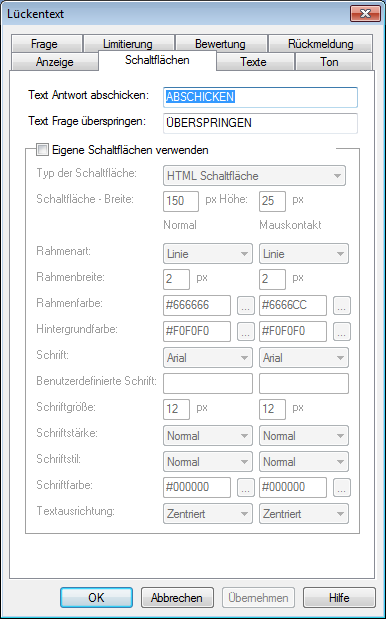 Auf den Registerkarten „Anzeige“, „Schaltflächen“ und „Texte“, können Sie die Anzeigeeinstellungen für das Objekt auswählen, sowie die Informations- und Warnmitteilungen bearbeiten.