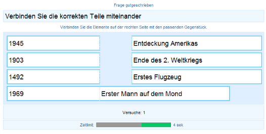 Bei der Zuordnung werden paarweise zusammengehörende Elemente gemischt und der Benutzer muß die korrekten Paare wieder herstellen (zb. Vokabel: deutsch <-> englisch, oder Ereignis <-> Jahreszahl, ...). Die Zuordnung ist 1:1, dh. zu jedem Element gibt es exakt ein Gegenstück (im Vergleich zu den Gruppenzuordnungen und Mehrfachzuordnungen).